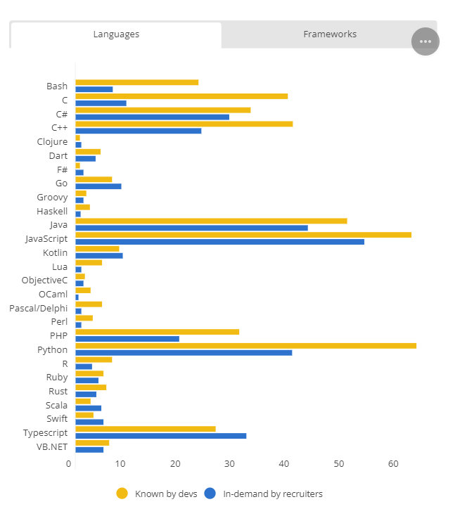 The report states that, as in previous years, programming languages JavaScript, Java and Python remain the most in-demand skills; and for the most part, demand and supply for the three most popular languages are consistent between developers and recruiters of. Demand for TypeScript, Swift, Scala, Kotlin, and Go skills all outstrip supply.