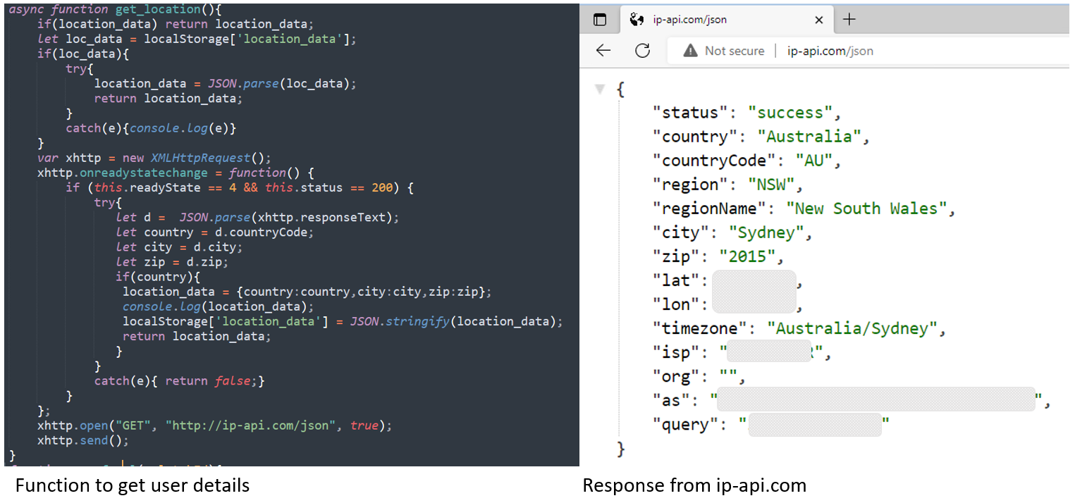 每次用户访问新 URL 时,数据都会通过 POST 请求传递。到达欺诈者的信息包括 base64 格式的 URL、用户 ID、设备位置(国家、城市、邮政编码)和一个 encoded referral URL。