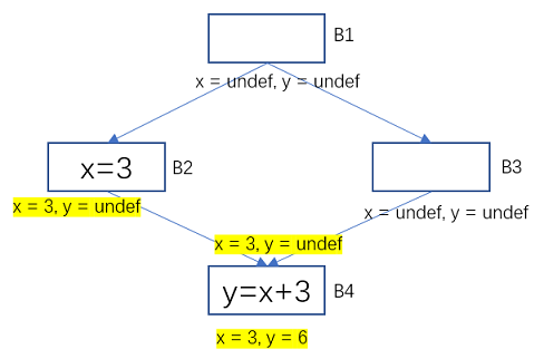 For example, in the flow diagram below, the yellow markers represent variable states that have changed due to the influence of program statements. The variable x has the value 3 in the basic block B2, and the value in B3 is undef, and after their confluence (the largest lower bound) is the constant 3.