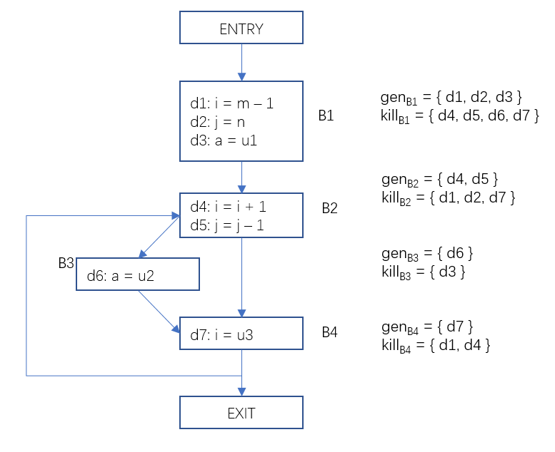 In this way, we get the input fixed value set and the output fixed value set of each basic block. For example, for basic block B4, the bit vector <0011110> represents {d3,d4,d5,d6}, which is the set of arrival fixed values at the beginning of the basic block, and the bit vector <0010111> represents {d3,d5,d6,d7}, which is The set of arrival fixed values at the end of the basic block. With this information, it is easy to get at a certain program point p, which variables are set and where.