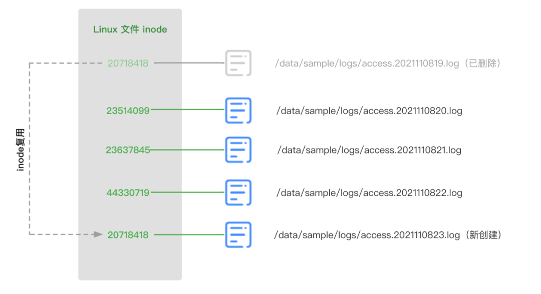 To design the unique identifier of the log file, if it is not feasible to directly use the name of the log file, the log file name may be frequently used repeatedly. For example, when the log framework used by some applications outputs logs, the current application is outputting The naming does not have any timestamp information. For example, it is always access.log. Only when the file is written in the current hour is completed, the file is renamed to access.2021110820.log. At this time, the newly produced log file is also named access. log, the file name is repeated for the collection Agent, so the file name cannot be used as the unique identification of the file.