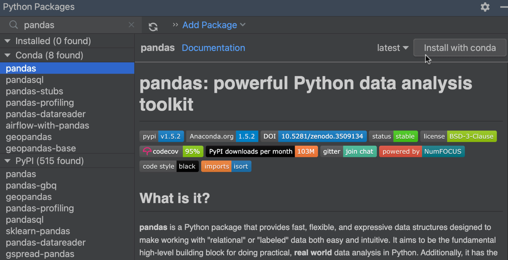 Search, install, and remove Conda packages without leaving the Editor window. The Python Packages tool window now works with the Anaconda package repository, allowing you to customize the Conda interpreter directly while writing code.