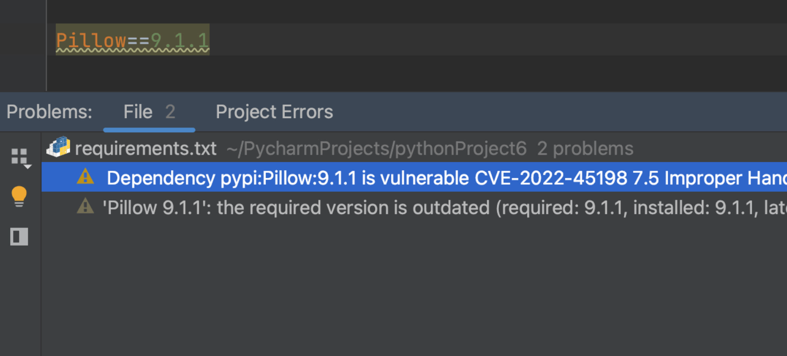 PyCharm will check packages against the Checkmarx SCA Database and the National Vulnerability Database to detect vulnerabilities in packages used in the project. The IDE will highlight packages that are considered vulnerable in package.json, requirements.txt, setup.py files. To see inspections, enable Security Inspections in Preferences / Settings | Editor | Inspections | Security.
